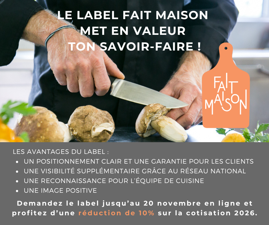 Votre savoir-faire vous distingue de la concurrence. L’adhésion au Label Fait Maison souligne votre cuisine maison et vous offre plus de visibilité grâce à un réseau national et des actions de communication autour de produits régionaux de saison.