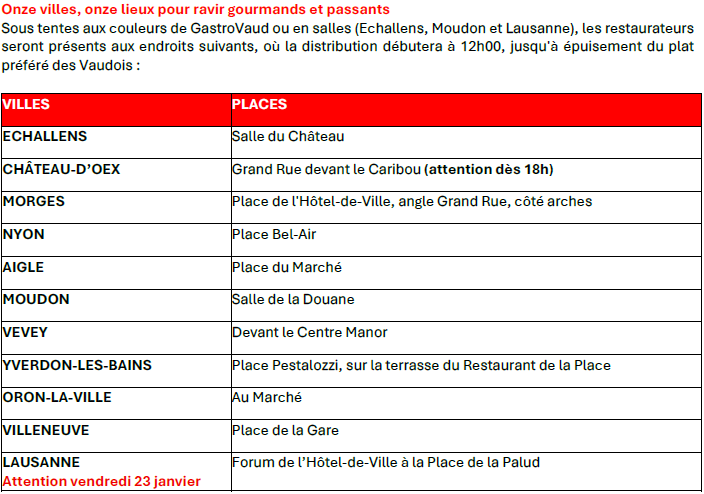 GOURMANDS, À VOS AGENDAS! Le 24 janvier, sur le coup de midi, GastroVaud offre sur les places de 10 villes vaudoises une succulente assiette de papet, accompagnée de sa saucisse aux choux. Attention vendredi 23 janvier à Lausanne! A déguster gratuitement et en toute convivialité, en l’honneur de nos traditions culinaires et de l’Indépendance vaudoise. Une action organisée en collaboration avec l’Association Charcuterie Vaudoise IGP et la Fédération vaudoise des producteurs de légumes.